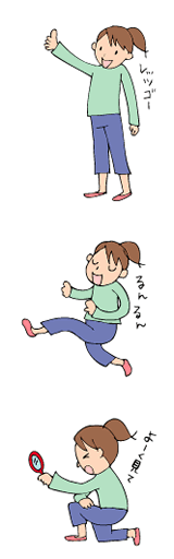 | 右目は大きく見開き、左目はギュッと閉じる。反対側も同様に(左右交互に×30回)。 | 両目をかたくつぶり、パッと大きく見開く(×20回)。 | ||||