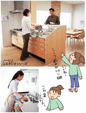 ノーリツHP “もたれバー”で水仕事も楽々。 ワークトップの前面を隠しながらほどよくオープンなのがうれしい。 |