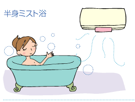「洗い場に腰掛ける」+「ミストを直接浴びない」 入浴時間30分 浴槽につからず、ミストも直接浴びない入浴法。浴室いっぱいのミストに包まれてサウナ気分でどうぞ!一般 的なサウナと違って息苦しくなく、熱さが苦手な方にもおすすめです。 |
