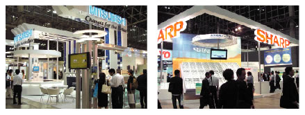 燃料電池や、風力発電といった新エネルギーが数々展示されていましたが、なかでもひときわ目を引いたのが、太陽光発電システムのメーカー。太陽光は、もっとも身近な新エネルギー。そういえば最近よく見かけるようになりましたよね。今では全国の戸建て住宅の100件に1件は太陽光発電を設置しているそうです。
